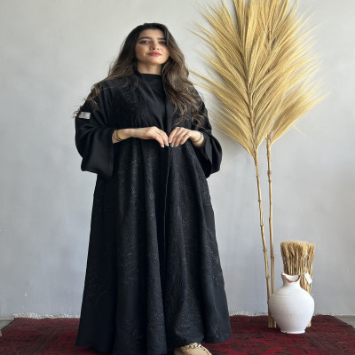 عباية سوداء كلوش بقصة مميزة مطرزة بالكامل من الامام، بتصميمها الفريد يعكس الفخامة والرقي توفر لك إطلالة ساحرة وجذابة في كل مرة ترتديها احصل عليها الآن .